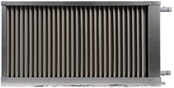 Теплообменник выполнен из медных труб с алюминиевым оребрением. Стандартно имеет трехрядное исполнение. Шаг оребрения составляет 2,1 мм (вместо общепринятого для наборных систем вентиляции 2,5 мм). Уменьшенный шаг позволяет существенно увеличить теплоотдачу и оптимизировать массогабаритные показатели при незначительном увеличении аэродинамического сопротивления теплообменника. Для увеличения теплоотдачи трубы механически расширены и тем самым жестко соединены с оребрением. Пайка калачей теплообменника осуществляется припоем с 2 % содержанием серебра, что обеспечивает высокое качество паяных деталей.