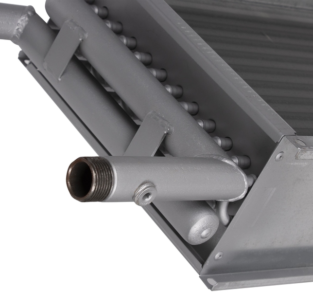 В водяном нагревателе используемый шаг оребрения составляет 2,1 мм., вместо общепринятого (для наборных систем вентиляции) 2,5 мм., что позволило существенно увеличить теплоотдачу, при этом не существенно увеличивается сопротивление теплообменника и оптимизируются массогабаритные показатели.
