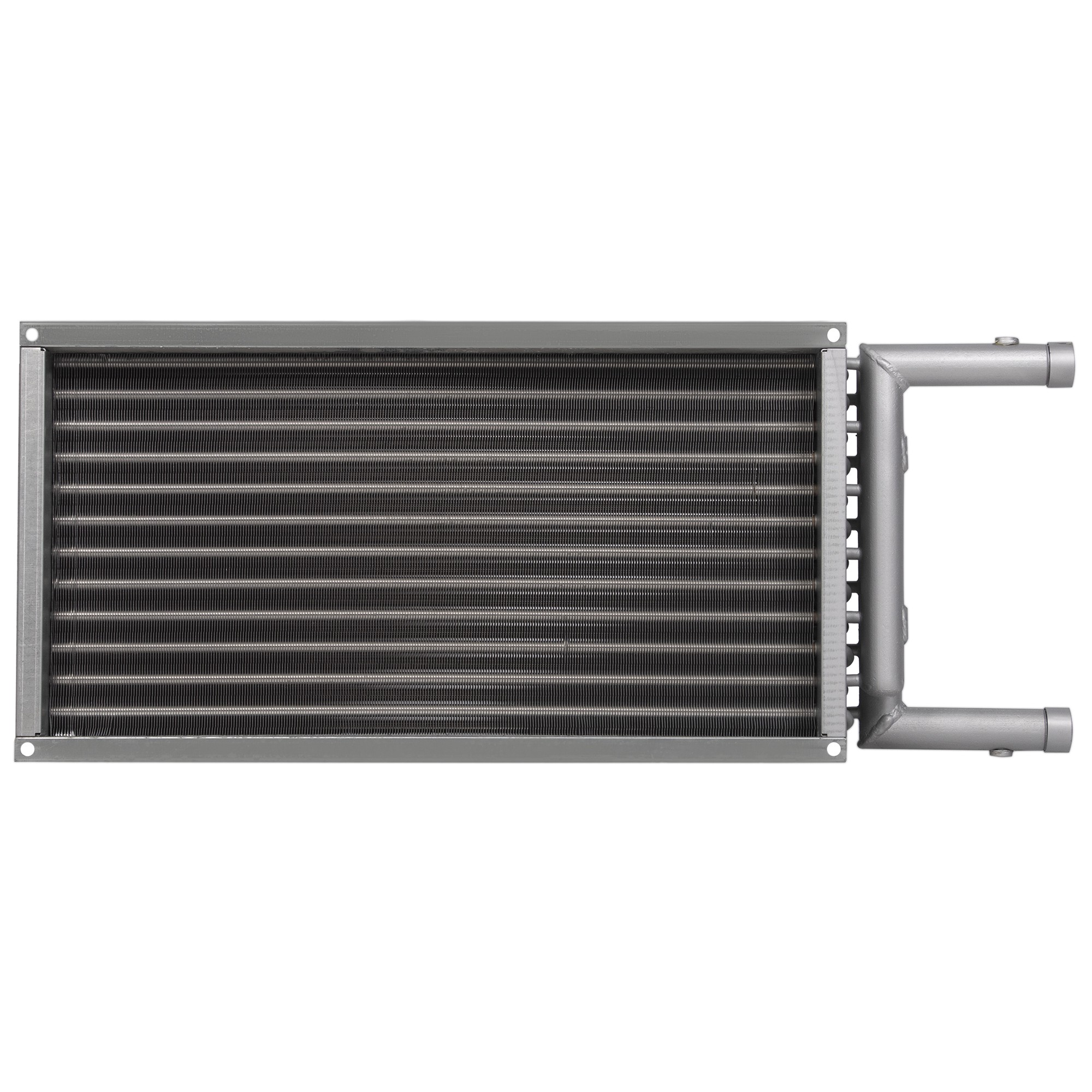 В водяном нагревателе используемый шаг оребрения составляет 2,1 мм., вместо общепринятого (для наборных систем вентиляции) 2,5 мм., что позволило существенно увеличить теплоотдачу, при этом не существенно увеличивается сопротивление теплообменника и оптимизируются массогабаритные показатели.